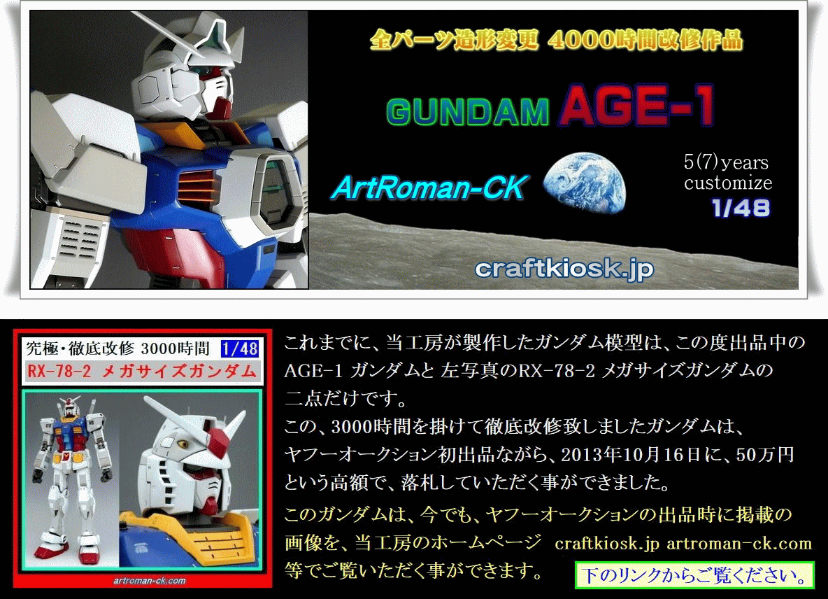 高額スタートとさせていただいておりますが、膝下の長さはMGガンダムと同等の17センチ、腕の長さ(肩を除く)はRGガンダムと同等の13センチあり、それぞれのパーツにMGガンダム、RGガンダムの徹底改修品と同等の時間と労力を注ぎ込んで製作していますので、5~7機のMGガンダム、RGガンダムの徹底改修作品が集結した作品とお考えいただけましたら幸いです。