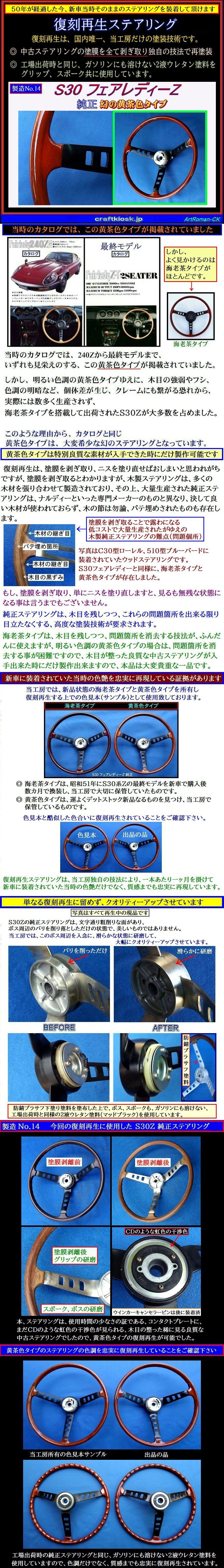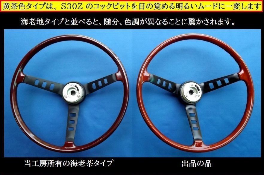 当工房は、新品状態の「海老茶タイプ」と「黄茶色タイプ」のS30Zステアリングを所有し、色見本(サンプル)として製作していますので、新車当時の色合いが完全再現されている事を保障できます。